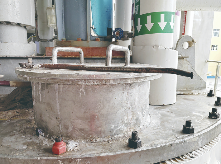 接着笔者又指着槽顶的螺栓问道:“你看,这些螺栓怎么也是碳钢材质的?这个螺栓上还戴了个保护套,还能看到防锈油,这可是硝酸铵管理的大忌啊!”